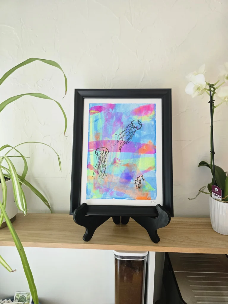 This piece features marine life such as jellyfish and a seahorse depicting the way one can just flow like water does. The blue hues are phenomenal.