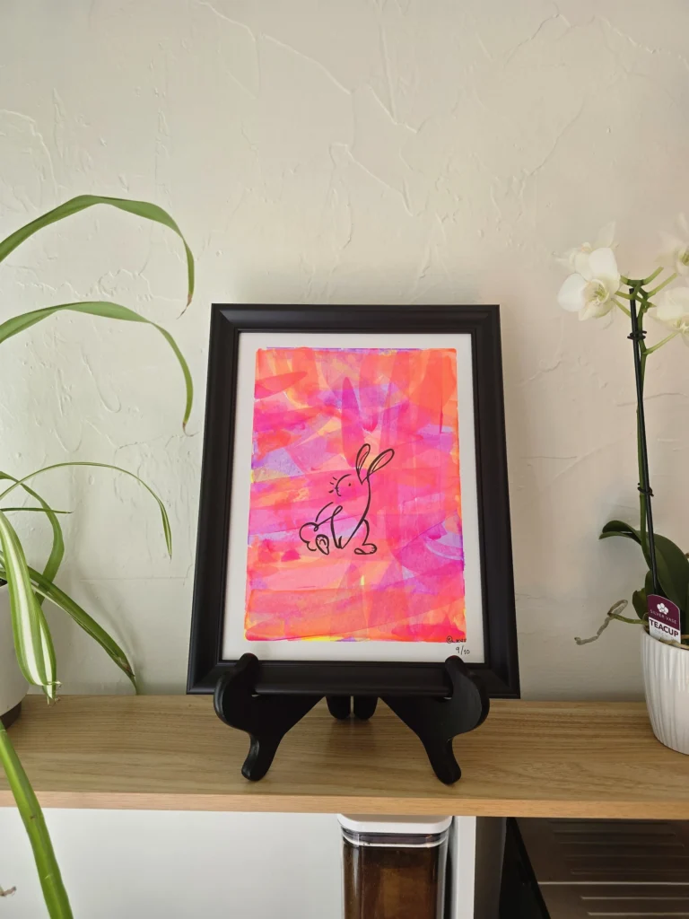 This piece features an abstract bunny, the artists daughters’ favorite. It is a very emotional piece as it was done with the love of a mother. Perfect for a nursery.